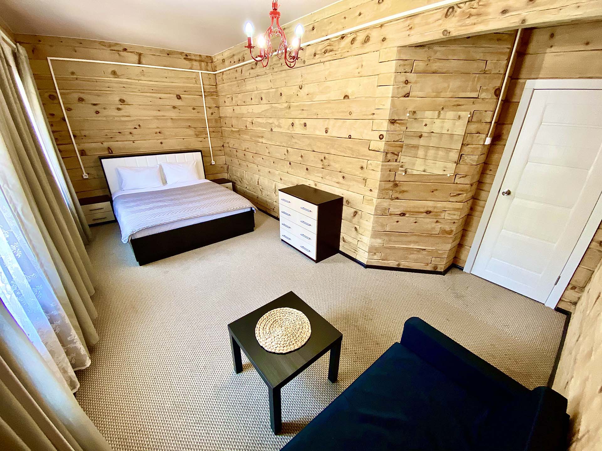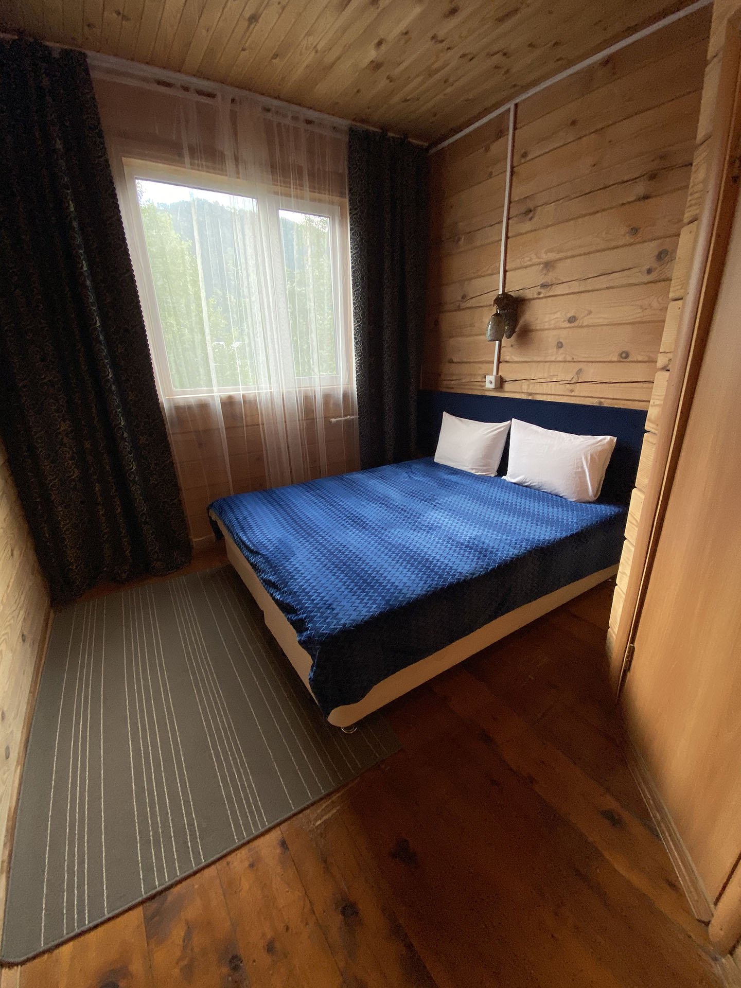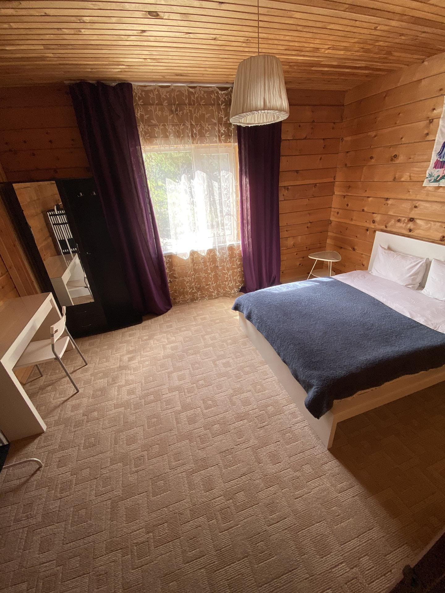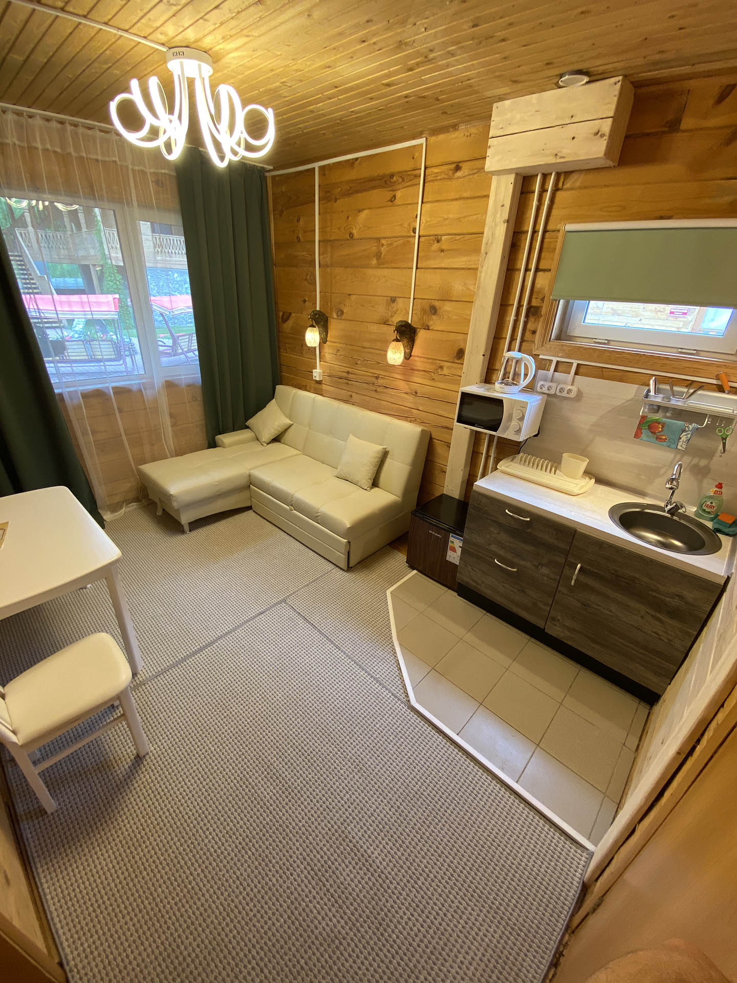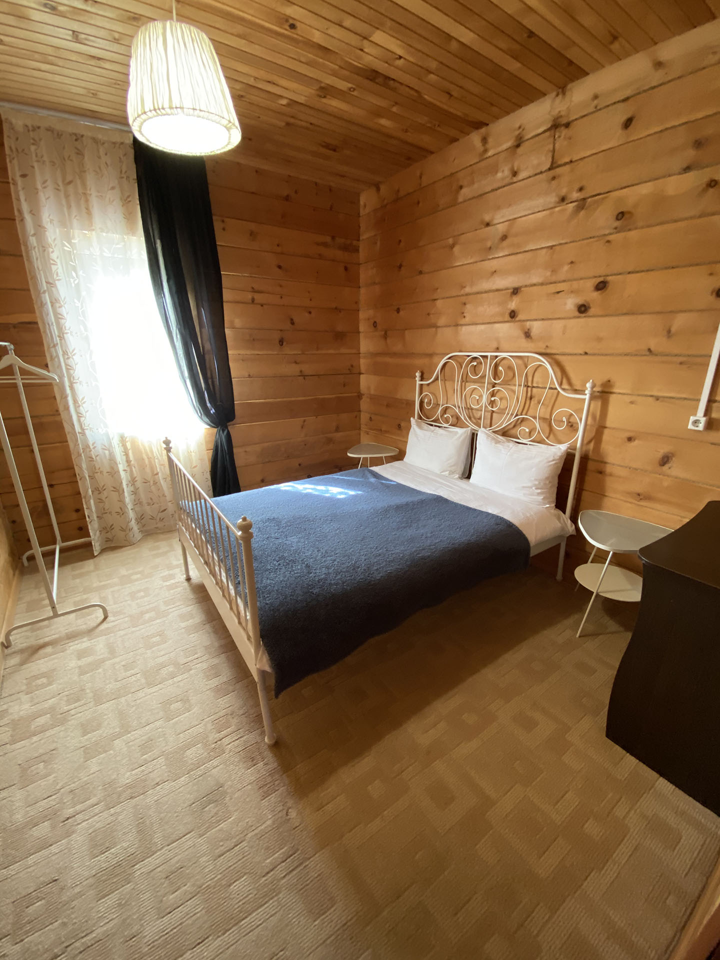 Четырехместный номер, спальня (двуспальная кровать) и зал (раскладной двухместный диван) также в номере (холодильник, чайник, микроволновая печь, обеденный стол), ванная комната (душевая кабина, раковина, унитаз, фен), тв – НТВ плюс (большой телевизор с плоским экраном), высокоскоростной Wi-Fi, собственный огороженный двор с садовой мебелью, допускается размещение с животными.