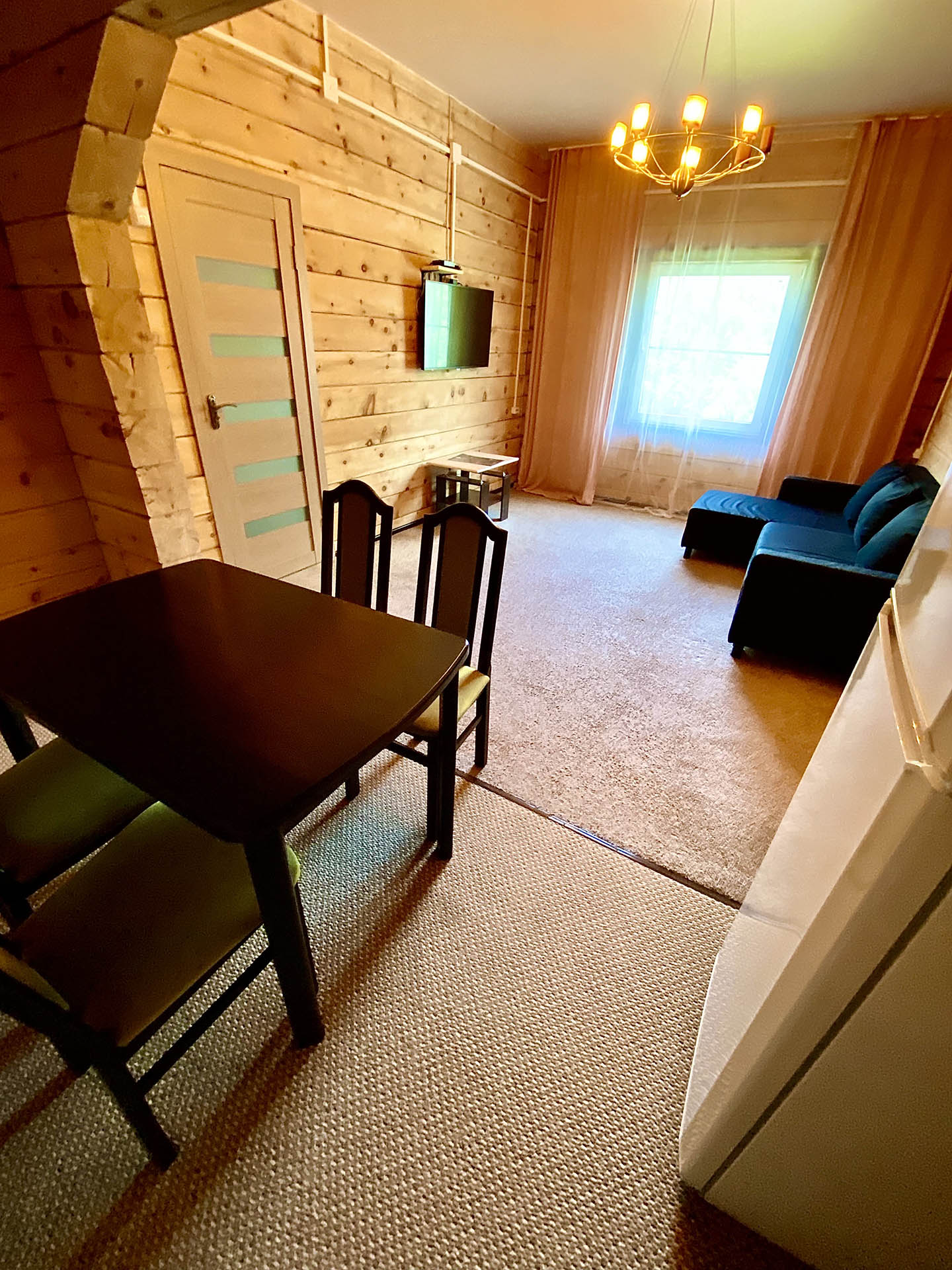 Четырехместный номер, спальня (двуспальная кровать) и зал (раскладной двухместный диван) также в номере (холодильник, чайник, микроволновая печь, обеденный стол), ванная комната (душевая кабина, раковина, унитаз, фен), тв – НТВ плюс (большой телевизор с плоским экраном), высокоскоростной Wi-Fi.